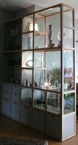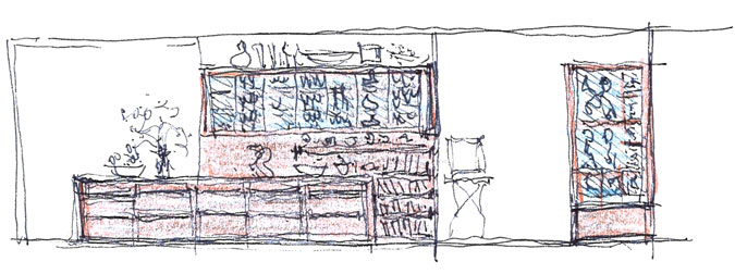 Réaménagement partiel de la cuisine, ouverture et agencements entre la salle à manger et la cuisine, création de meubles de rangement et d’exposition.