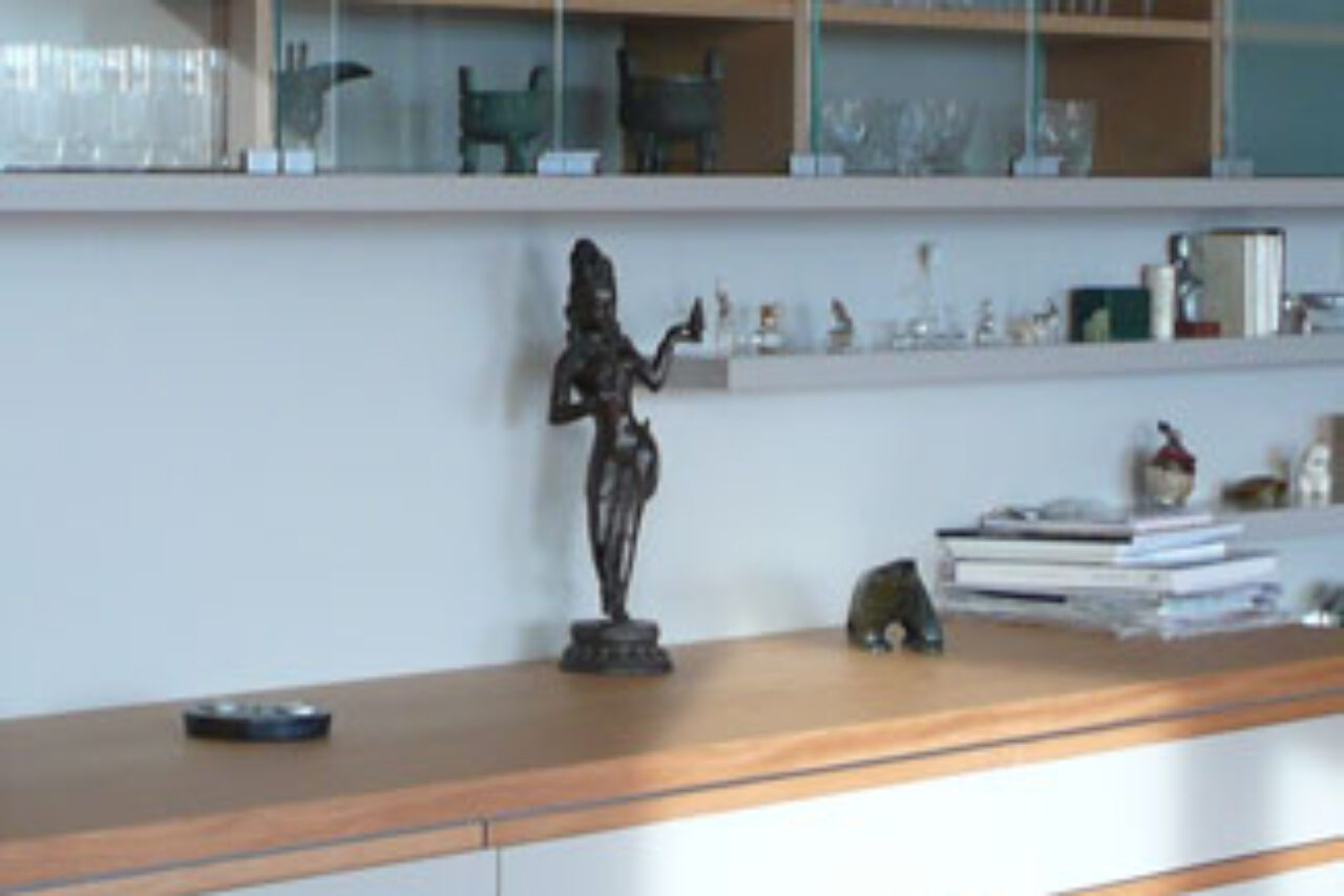 Réaménagement partiel de la cuisine, ouverture et agencements entre la salle à manger et la cuisine, création de meubles de rangement et d’exposition.