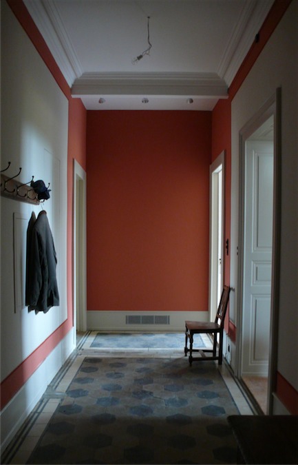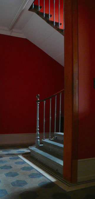 Le hall et la montée d’escaliers ont été restaurés et séparés de l’appartement du rez par une porte en grande partie vitrée afin de garder la perception complète des espaces de distribution d’origine.