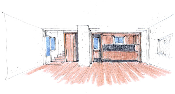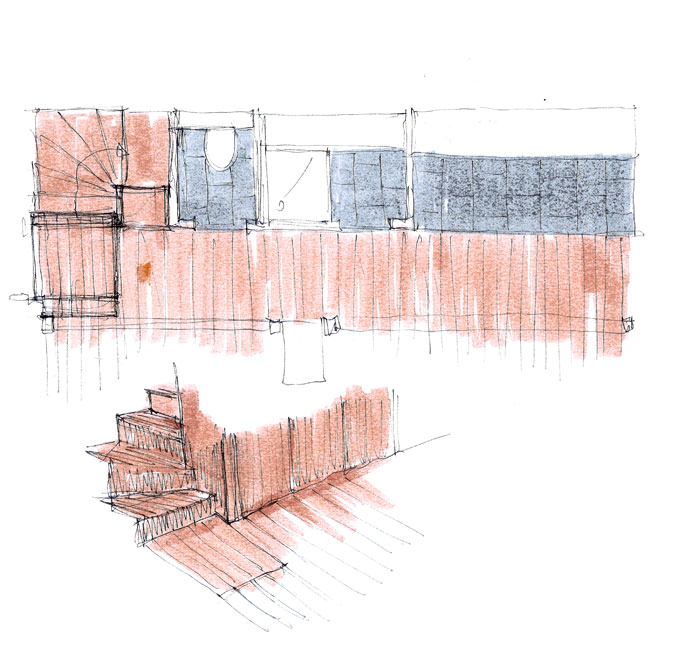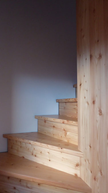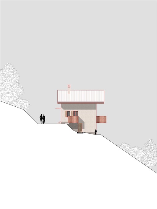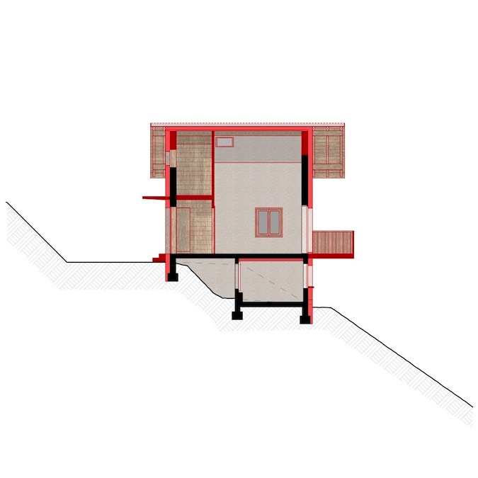 La maison date du début des années 50, construite en maçonnerie, elle se dresse à flan de pente, devant une vue magnifique. Le projet a permis d’agrandir la maison en la surélevant sans perdre la simplicité de sa forme initiale. L’intérieur a été simplifié, le couloir et les deux pièces existantes ont été démolis et remplacés par un grand espace de jour. Les salles d’eau et la cuisine ont été comme installées dans un grand placard posé contre le mur nord. L’escalier vers le 1er étage se glisse derrière le placard.