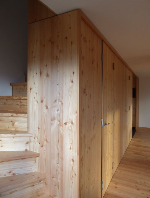 Afin de donner plus de présence au paysage cadré par les fenêtres, le nombre des matériaux de finition est réduit au mélèze, l’ardoise noir et la peinture blanche.
