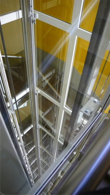 Installation d’un ascenseur dans la cage d’escalier existante, projet de mise en couleur et d’éclairage de la cage d’escalier.