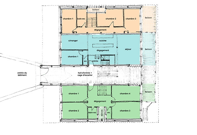 Proposition de deux variantes, esquisse des différents plans d’appartements et des dispositions d’apport de vues et de lumière.