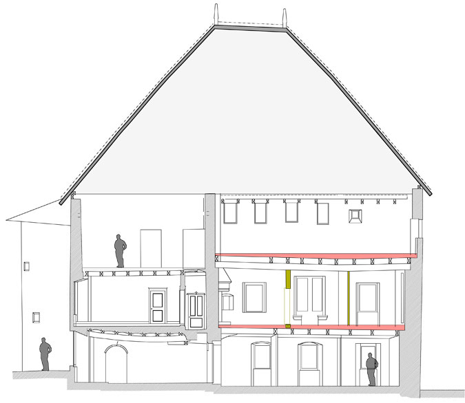 Travaux de conservation et de consolidation des structures porteuses dans la partie sud-ouest du bâtiment.
